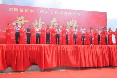 朝陽聚聲泰(信豐)科技有限公司董事長郭橋生、客戶代表韓國大元有限公司金炳日分別在開工慶典儀式上致辭。參加慶典儀式的縣領導和企業方負責人一起為項目剪彩,并共同見證了合作簽約儀式,參觀了朝陽聚聲泰(信豐)科技有限公司展廳,了解企業智能聲學產品的研發和運用情況。