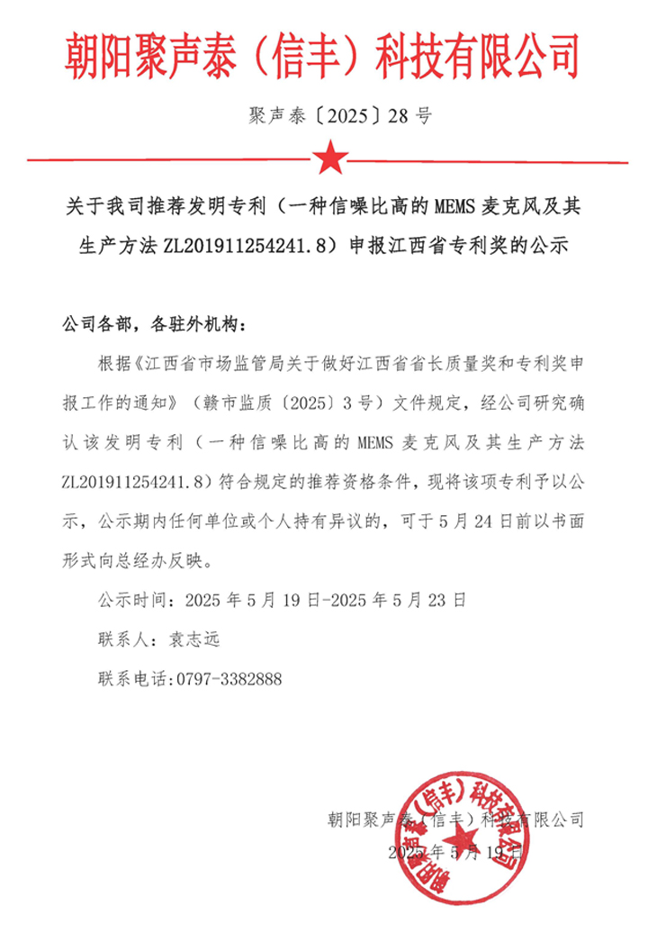 《一種信噪比高的MEMS麥克風及其生產方法》江西省專利獎的公示